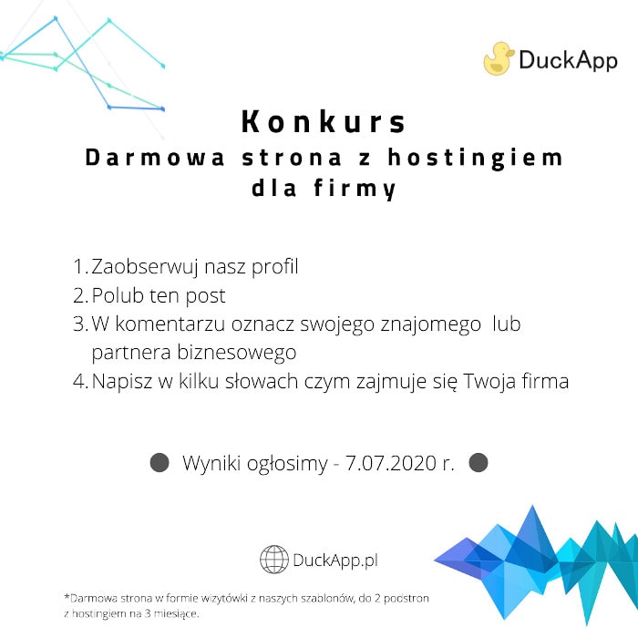 Pierwszy post na naszym blogu firmowym oraz pierwszy konkurs! Możecie zgarnąć od nas pakiet na podstawową stronę www dla Waszej firmy z hostingiem na 3 miesiące – a to zupełnie za darmo! Zasady są proste i jasne, a sam konkurs jest dostępny dla każdego kto posiada konto na Facebook lub Instagram. Zasady konkursu na darmową […]
